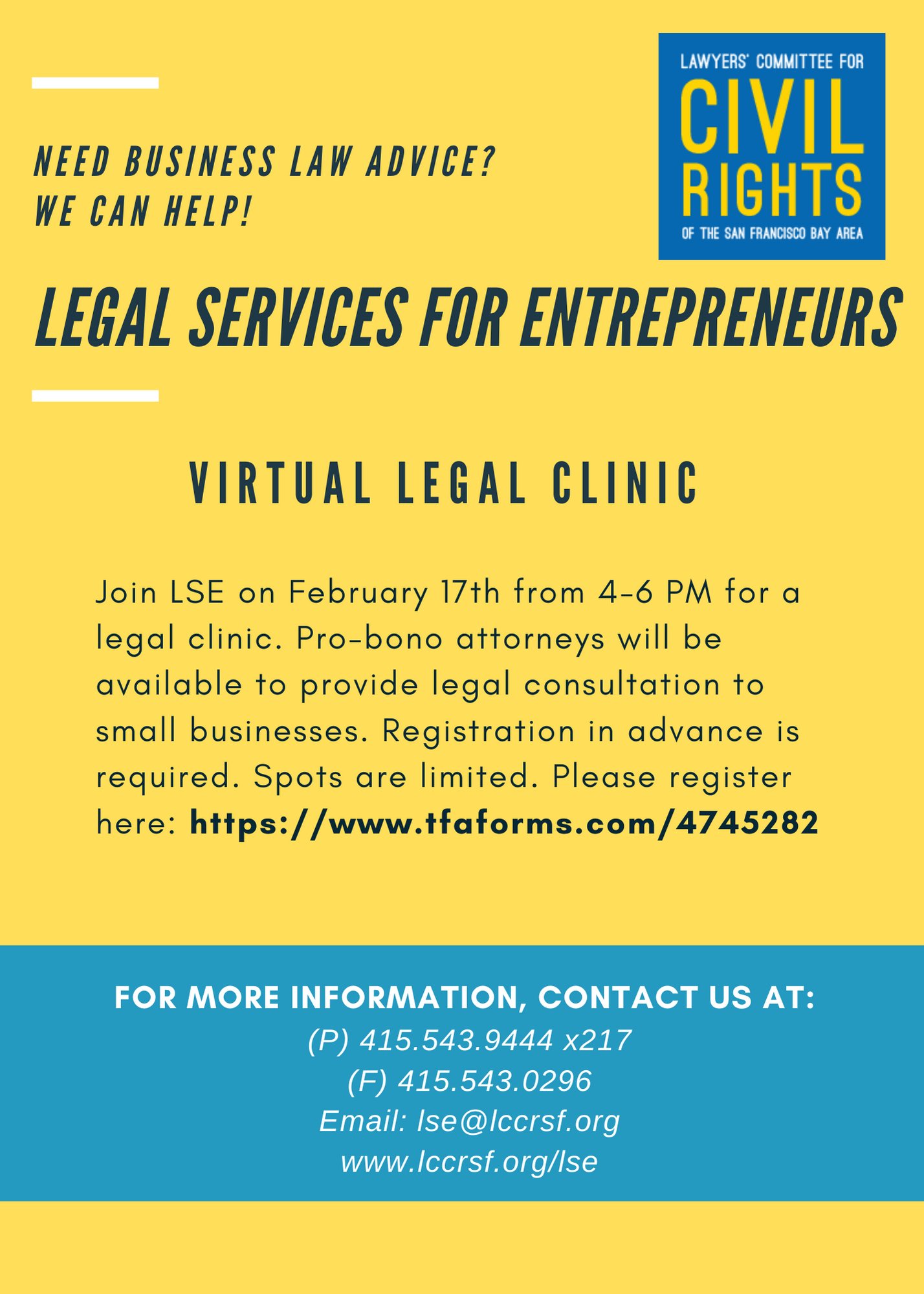 Lawyers Committee For Civil Rights Bay Area On Twitter Legal Services For Entrepreneurs Is Excited To Provide A Free Legal Clinic For Low Income Small Business Owners Participants Can Explain Their Legal Issues